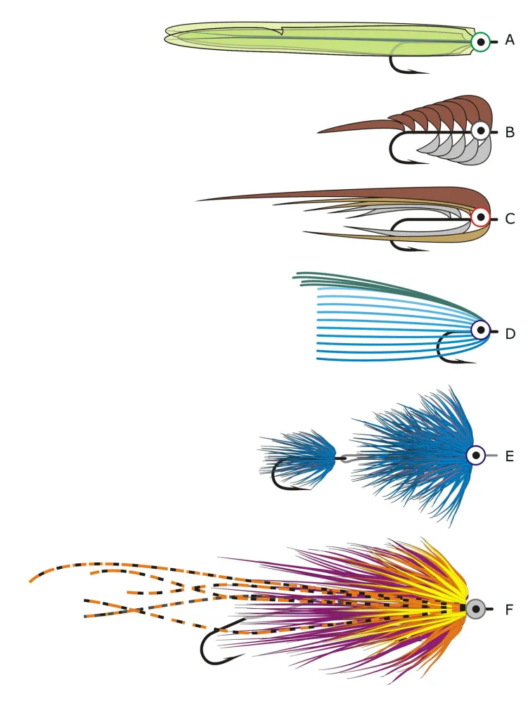 Five examples of ways to tie large flies. From top to bottom:
