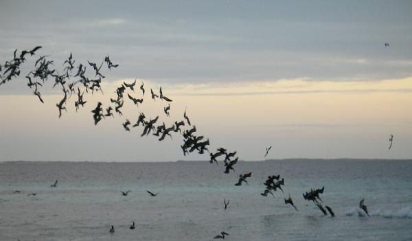 Pelicans diving. The whole gang gathers at dusk and enjoy dinner together.